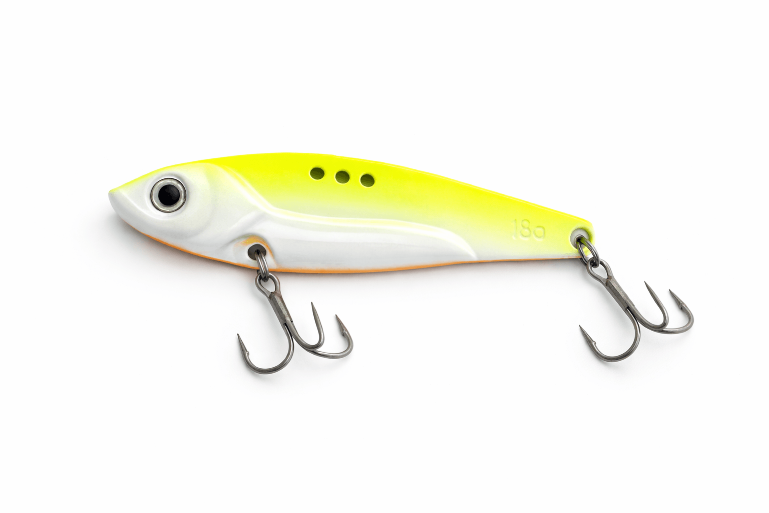 Son coloris dos jaune et ventre blanc joue un rôle clé. Vu de dessus, le jaune apporte de la visibilité et attire l’attention, tandis que le ventre blanc renvoie la lumière à chaque vibration. Ce contraste fonctionne particulièrement bien en eau teintée ou sur des zones brassées, où les poissons doivent identifier rapidement une proie. Des espèces comme le lieu, le merlan ou le grondin y réagissent très bien, notamment lorsqu’elles sont en phase d’alimentation proche du fond.