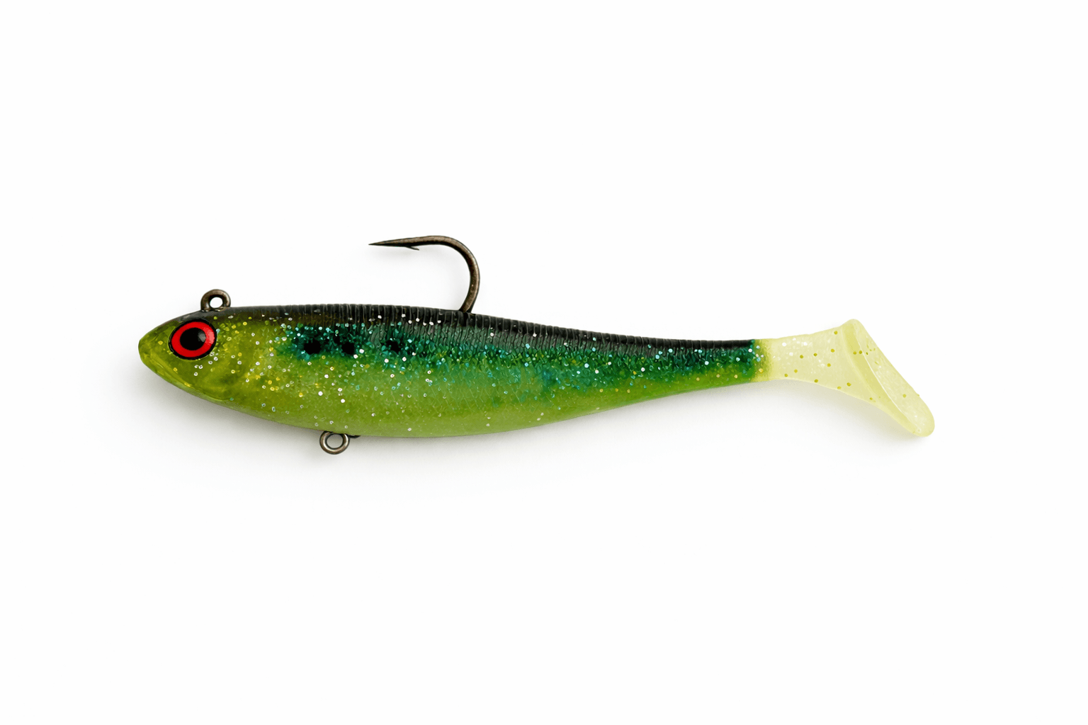 Sa teinte verte s’inscrit dans une logique d’imitation réaliste. Elle rappelle les proies évoluant près du fond ou dans des zones riches en végétation et en structures. Ce coloris fonctionne particulièrement bien sur des espèces comme le bar, le lieu ou le maigre, notamment lorsque les poissons chassent de manière ciblée et prennent le temps d’analyser.