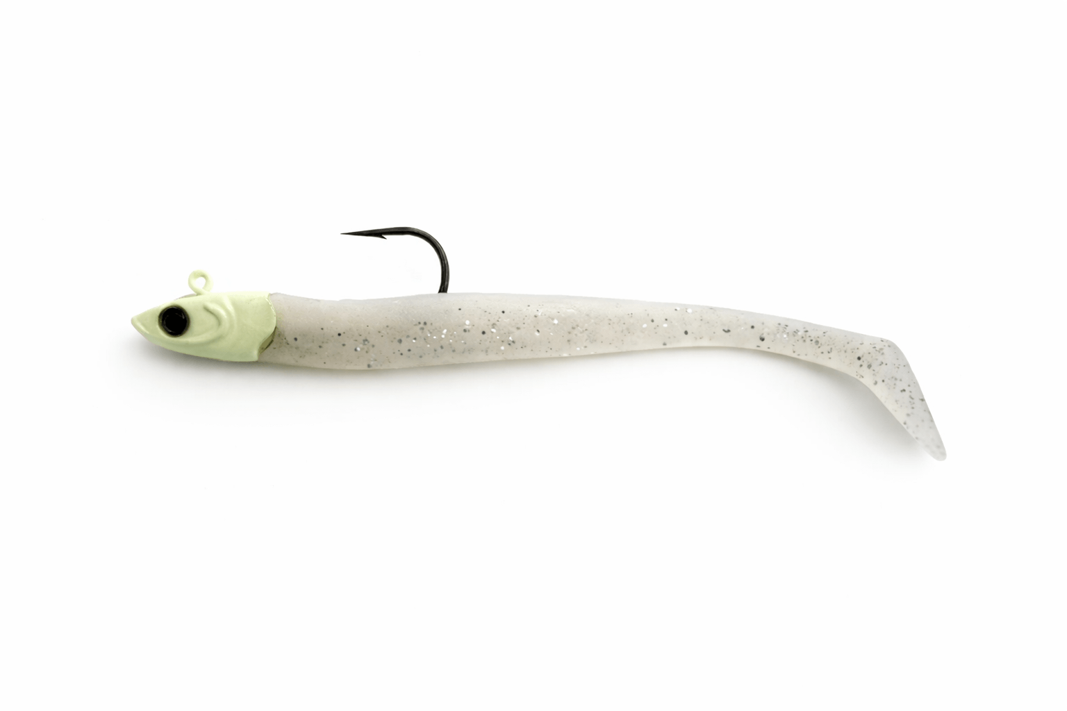 Dans la catégorie des leurres souples, il se distingue par une approche très lisible. Sa teinte blanche agit comme un point de repère clair dans la colonne d’eau. Elle capte la lumière, crée un contraste net et imite parfaitement une proie affaiblie ou isolée. C’est exactement le type de signal qui déclenche l’instinct de chasse du bar, du lieu ou du chinchard, surtout dans des zones actives ou brassées.